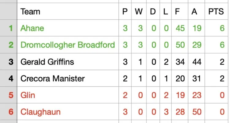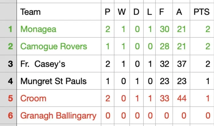 Fr Caseys GAA Club Notes:Recent Results: County Senior League – Division 1 Fr. Caseys 0-10 St. Kierans 1-07. County Junior League – Division 5 Fr. Caseys 3-12 Camogue Rovers 2-22. County Senior League – Division 1 Fr. Caseys 1-18 Newcastle West 2-16Limerick GAA: There was no joy for the Limerick Foo