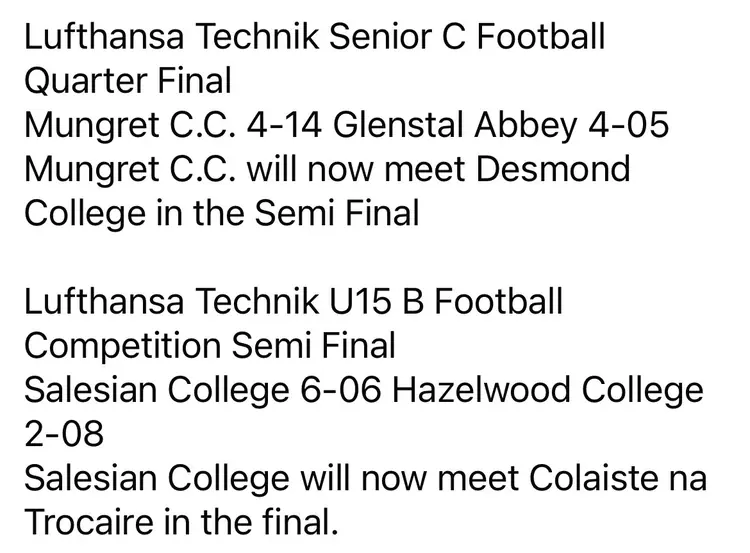 Lufthansa Technik, Limerick Post Primary Schools Friday Results: Friday 10th OctoberLufthansa Technik Senior C Football Quarter Final Mungret C.C. 4-14 Glenstal Abbey 4-05 Mungret C.C. will now meet Desmond College in the Semi FinalLufthansa Technik U15 B Football Competition Semi Final Salesian Co